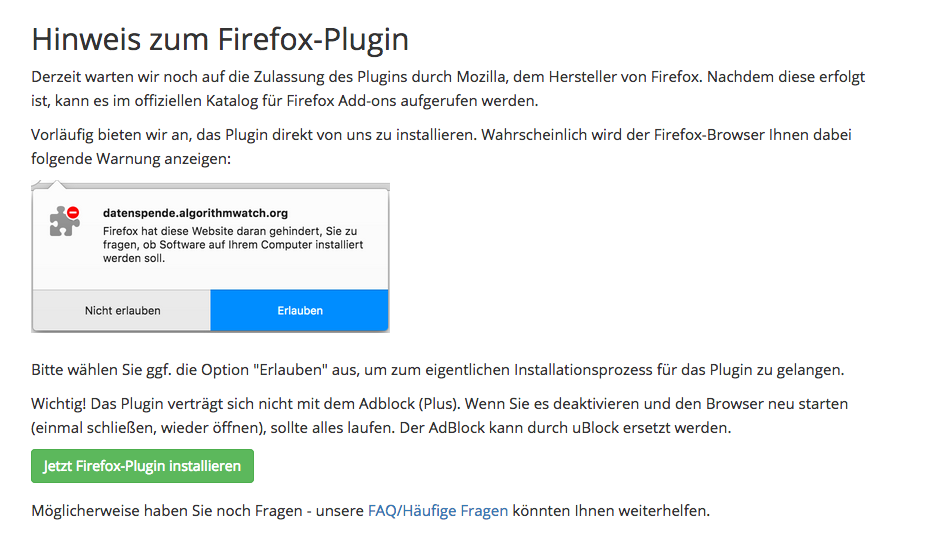 Die Projektverantwortlichen suchen bis Ende September Freiwillige, die sich ein Plugin für den Chrome- oder den Firefox-Browser installieren. Ich habe das Plugin in Firefox aktiviert. Hinweis am Rande: Es kommt bei der Installation die Meldung, dass Mozilla, Hersteller von Firefox, das Plugin (noch) nicht zugelassen hat (siehe Screen).