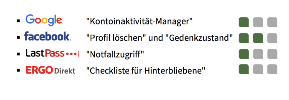 Ich sehe die Vorsorgefunktion des digitalen Nachlasses aber auch als unternehmerische Verantwortung. Es gibt bereits Portale, die Nutzern schon bei der Anmeldung Tools für den Fall ihres Todes an die Hand geben. Google bietet beispielsweise einen Konto-Inaktivitätsmanager, Facebook den Button „Profil löschen“ und „Gedenkzustand“ und die Versicherung ERGODirekt hat eine Checkliste für Hinterbliebene zusammengetragen.