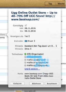 Das perfide an dieser „Einladung“ ist, dass man sie nicht löschen kann. Unter der Nachricht stehen die Buttons „vielleicht“, „ablehnen“ oder „annehmen“. Intuitiv möchte man wütend auf den Button „ablehnen“ drücken. Aber Vorsicht: Genau mit dieser Aktion verifiziert man dem Spammer die eigene E-Mail-Adresse. Und es gibt Leidensgenossen. Im Adressfeld finden sich einige unter meiner E-Mail-Adresse.
