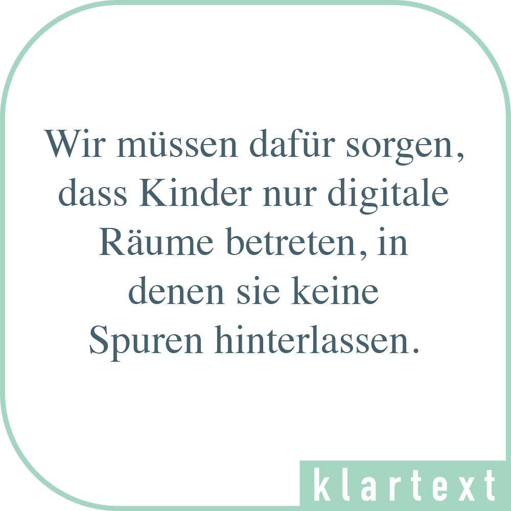 Wie vor Drogen und verfrühter Strafverfolgung, müssen Kinder und Jugendliche, solange sie nicht volljährig sind, vor der unfreiwilligen Digitalisierung ihres Lebens geschützt werden. Es kann und darf nicht sein, dass man „pädagogisch“ versucht, sie fit für eine missbrauchte und zerstörte digitale Kultur zu machen. Wir müssen dafür sorgen, dass Kinder nur digitale Räume betreten, in denen sie keine Spuren hinterlassen. Es geht um nicht weniger, als Unternehmen gesetzlich zu verbieten, an uns alle, insbesondere aber unsere Kinder, Produkte auszugeben, die in irgendeiner Form Aktivitäten, Orte und Zeitpunkte aufzeichnen.